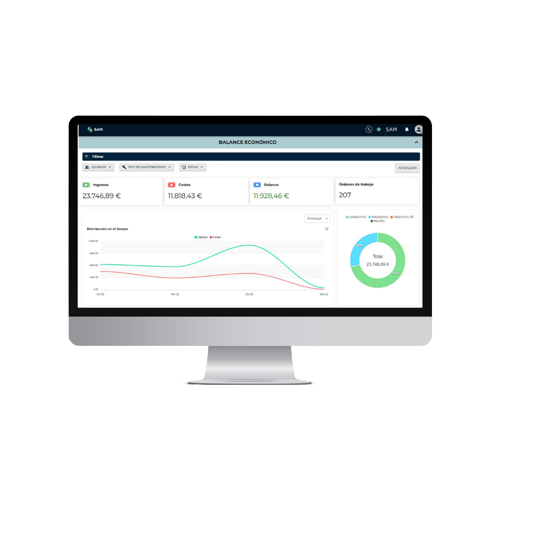 Con la gestión de equipos en la nube a través de SAM, podrás optimizar la gestión económica, órdenes de trabajo, y tener un mayor control de las operaciones en tiempo real. Además, SAM, te facilita la toma de decisiones gracias a su sofisticado software para generar informes avanzados